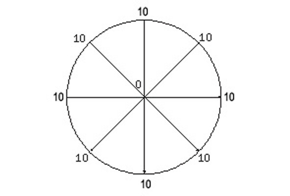 Рисуем колесо и делим его на 8 секторов. В середине ставим ноль, по краям десять.