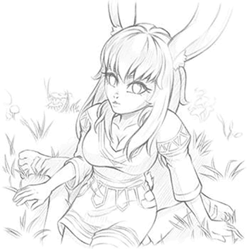 Как и ожидалось, в нескольких метрах впереди, чуть сбоку от тропы, шаря руками по траве, ползала девушка-кролик с серой шерстью на теле и длинными светло-голубыми волосами на голове. Она была одета в короткое коричневое платье без рукавов, а головным убором ей служил венок из свежих цветов. Сомнений не было – она искала этого зверька. Но делала это странно, словно не видя ничего перед собой и просто ощупью пытаясь обнаружить его.
