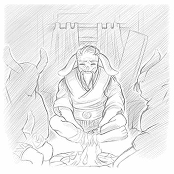 Здесь не было кроватей, и в целом обстановка немного отличалась от других домиков, которые Макс видел раньше. Пол был застелен большим квадратным ковром чёрного цвета, на котором сидели трое старых кроликов – Ганабира, Долония и очень древний на вид кролик с большим деревянным посохом в руках. Ещё один старик восседал на некоем подобии колченогой лавочки у стены. Посередине стоял низкий круглый столик. А темно в хижине было, потому что окно…