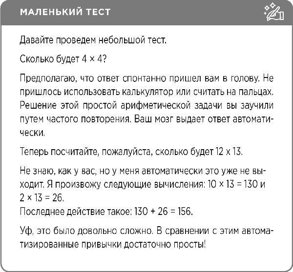 Наш мозг пробует делать именно это: создавать из проверенных действий как можно больше привычек. Это экономит энергию и не требует усилий. Если мы вновь и вновь, каждый день, делаем что-то одним и тем же способом, будет, конечно же, нелепо всякий раз обдумывать свои действия. То есть мозг перестраивается таким образом, чтобы действие осуществлялось практически непроизвольно, как только появляется соответствующий внешний раздражитель. Будильник звонит – мы идем чистить зубы.