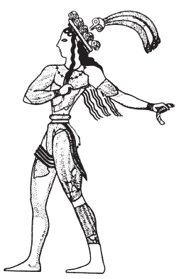 Мужчины обычно носили набедренную повязку, узкий пояс, а иногда короткую юбку, женщины – юбку, узкий пояс и порой корсаж с глубоким вырезом, обнажающим грудь. Мужчины брили бороды. Представители обоих полов были гибкими и худощавыми, отращивали длинные волосы и вместе присутствовали на спортивных состязаниях и публичных церемониях. На фресках мы видим акробатов: мужчины и женщины, одетые в одинаковые набедренные повязки и пояса, кувыркаются на спинах бегущих длиннорогих быков. О мирной и веселой жизни на открытом воздухе свидетельствуют сценки, изображающие боксеров в перчатках, пирующих сборщиков урожая, танцующих девушек, пьющих юношей и зрителей обоих полов, следящих за состязаниями и танцами. В великолепных изображениях цветов, деревьев, животных и рыб, выполненных нежными красками разнообразных оттенков, проявляется жизнерадостное отношение минойцев к окружающей их природе. Это самая распространенная тема живописи; военные сцены и даже изображения людей встречаются сравнительно редко.