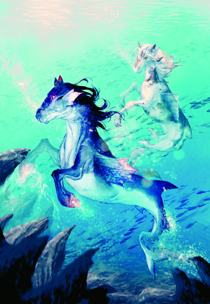 Аквина затаила дыхание, увидев, как два келпи, подняв небольшую волну, появились из грота и склонились перед Эксеной. Вокруг изящных точёных голов как шёлк колыхались длинные гривы. Копыта на передних ногах поросли мхом, вместо задних ног у морских коней были рыбьи хвосты.