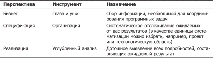 Координация информационных потоков – это тот род деятельности руководителя, который требует отдельного рассмотрения. Как вы, я надеюсь, помните, согласно методике объектно-ориентированного (OO) анализа и проектирования, для формулирования проектного решения и разрешения проблем, связанных с конструированием программного продукта, вы должны иметь в виду три перспективы. Если хотите освежить память, взгляните на табл. 3.1.