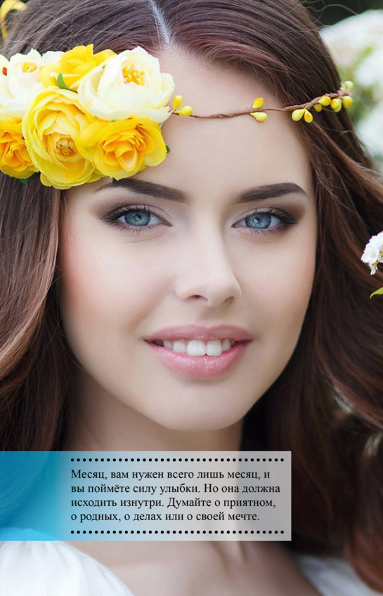Месяц, вам нужен всего лишь месяц, и вы поймёте силу улыбки. Но она должна исходить изнутри. Думайте о приятном, о родных, о делах или о своей мечте. Читайте эту главу каждый день, думайте об этом состоянии каждый день. При любых мыслях у вас должна автоматически срабатывать мысль об улыбке. Так будет до тех пор, пока это не войдёт в привычку.