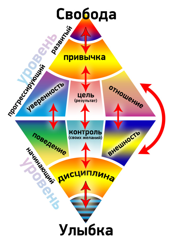 Представленная двухсторонняя пирамида демонстрирует взаимозависимость между основными разделами и элементами, принадлежащими каждому уровню. В основе любого развития разместилась (улыбка), ощущение счастья и любви к жизни. Следующий фактор для развития – это дисциплина и ответственность за свою жизнь и жизнь близкого человека. Это сильное испытание для человека, не сорваться и придерживаться своей цели и своего пути. Для этого необходимо овладеть следующей ступенью – контролем.