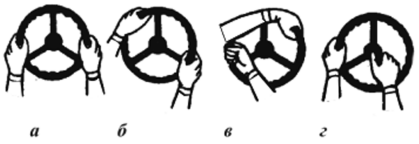 При формировании правильных и рациональных навыков безопасной езды начинающему водителю следует уделять технике управления рулевым колесом особое внимание, это поможет избежать опасных ошибок в критических дорожно-транспортных ситуациях. К ним относятся: открытый обхват рулевого колеса (рис. 8а), когда большие пальцы рук располагаются снаружи и нет возможности блокировать внезапное вращение руля, вызванное реакцией дороги, особенно при движении по песку, колее, при наезде на небольшое препятствие; обхват в нижнем или верхнем секторе (рис. 8б, 8 г), что уменьшает точность руления, угол и скорость поворота; обхват и поворот рулевого колеса за спицы (рис. 8в) и сильное перекрещивание руки не позволяют повернуть руль на больший угол; руление с перехватом в нижнем секторе руля (рис. 8д), что свидетельствует о недостаточной координации движений; крутое руление одной рукой с постоянно раскрытой кистью (через ладони) ослабляет контакт с рулевым колесом и может произойти проскальзывание руки по ободу; полное отпускание рулевого колеса вследствие каких-либо действий может вызвать неожиданное самопроизвольное изменение направления движения. Ошибочные действия, доведенные многократными повторениями до автоматизма, устраняются с большим трудом, требуют специальных тренировок, а в последующем строгого самоконтроля.