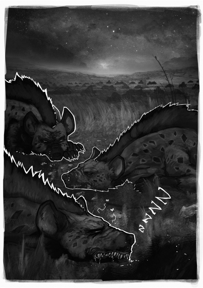 Eine großgewachsene Hyäne trat aus dem Eingang. Geschmeidig bewegten sich ihre Läufe. Ihre muskulösen Vorderbeine waren deutlich länger als ihre stämmigen Hinterbeine. Von ihrem massiven Kopf ausgehend, fiel ihr buschig behaarter Rücken sanft nach hinten ab. Im Zwielicht des Kerzenscheins hob sich die schwarze Mähne deutlich vom fleckigen Hellbraun des übrigen Felles ab. Sie überragte die anderen Hyänen im Lager fast um das Doppelte. Die beiden Jungen hielten den Atem an.