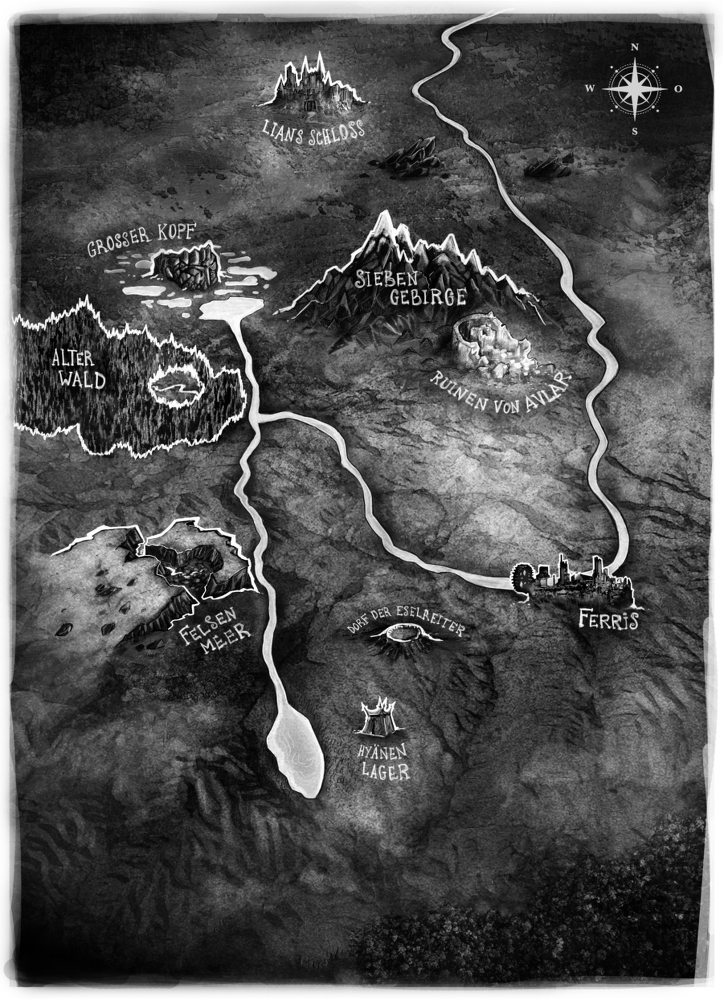 Die Ebene des Brachtlandes verwandelte sich im Westen langsam in ein hügeliges dichtbewaldetes Bergland, in dem auch, wie ihr ja schon wisst, der Wald der Wölfe lag. Nördlich, noch eine Tagesreise von den ersten Ausläufern des Siebengebirges entfernt, findet man die Stadt Avlar. Und im Osten? Nun, dort erhoben sich die eisernen Schlote von Ferris.