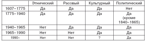 И Германия, и Франция, и Россия (СССР) на протяжении своей истории устанавливали различные приоритеты среди элементов национальной идентичности, и значимость этих элементов менялась с течением времени. То же самое верно и в отношении других стран. А что же Америка? Какой преимущественно была ее идентичность – аскриптивной, территориальной, культурной, политической, экономической? И как она менялась за столетия своего существования?