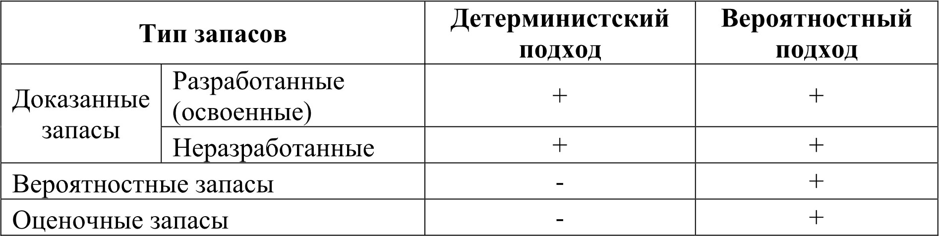 Ю. Н. Новиков отмечает [46], что количественная оценка запасов на месторождении производится с применением одного из двух подходов: детерминистского или вероятностного. В рамках детерминистского подхода к оценке запасов полезных ископаемых дается единственная, наиболее точная оценка объемов запасов полезных ископаемых, расчет которой основан на известной геологической информации. Вероятностный подход предусматривает построение серии оценок объемов запасов и определения вероятности каждой из приведенных оценок на основании известной геологической информации. Сравнение видов запасов, включаемых в оценку при использовании указанных подходов, представлено в табл. 1 (составлена авторами монографии).