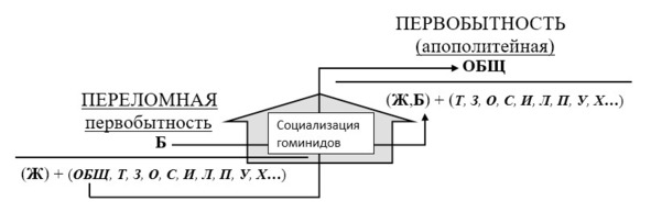 Рис. 7. Революционный процесс обобществления «человечающегося» объекта «человек» «животного состояния» из «тасующиегося стада», или социализация гоминидов
