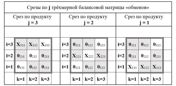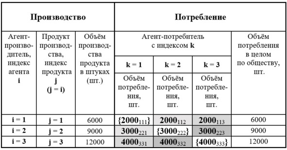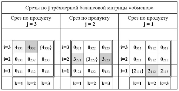Наконец, но тёмно-серой тонировкой, выделены элементы матрицы с индексами (223) и (332), отражающие обмен продуктами с индексами j = 2 и j = 3 между агентами с индексами i=2 и k=3 (или, иначе, i=3 и k=2).