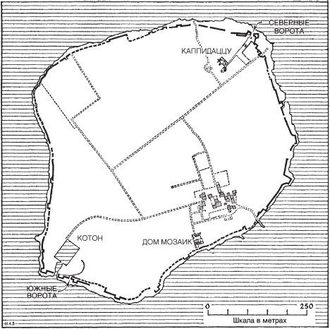 Из зданий найдено только два (рис. 7): прекрасный дом в греческом стиле у юго-восточного побережья и фундаменты того, что могло быть храмом или другим общественным зданием в месте, называемом Каппидаццу (Cappiddazzu). Это здание несколько раз перестраивалось, в последний раз – в V веке; сохранилась прекрасная кладка из тесаного камня.