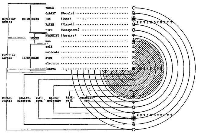 Если я возьму любую группу предметов во вселенной и обнаружу (выражаясь математическим языком) (i) их «наибольший общий делитель», или высшую единицу иерархического статуса, из которой они все составлены; а также (И) их «наименьший общий множитель», или низшую единицу иерархического статуса, составляющими которой они все являются, то я обнаружу, что (i) является низшим членом, а (ii) – высшим членом одной из шести иерархических Пар – Целое-Центр, Галактика-электрон, Солнце-атом, Земля-молекула, Жизнь-клетка, Человечество-человек. (Это заявление не абсолютная истина, однако оно достаточно близко к истине, чтобы служить условным определением того, что я имею в виду под иерархическими Парами).