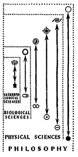 Более того, история науки свидетельствует не только о существовании иерархических Пар, но также и об их порядке. В средние века увлекались «божественной наукой» наивысшей Пары. Основы современной физики и астрономии были заложены в XVII веке, химии и геологии – в XVIII и в начале XIX века, биологии – в XIX веке, психологии, социологии и экономики – в конце XIX и начале XX века. И в этой последовательности нет ничего удивительного – этот порядок их появления является порядком логической зависимости: более поздним наукам нужны более ранние. Как я уже говорил, философия и теология были предпосылкой для светской или естественной науки: в широком смысле философия все еще охватывает всю науку в целом, тогда как в узком смысле она ограничена наивысшей Парой. Точно так же физическая наука предшествует и включает биологические науки и лежит в их основе, сохраняя для своей собственной области «неодушевленные» и астрономические единицы. А биологические науки предшествуют и включают антропологические науки, и лежат в их основе.
