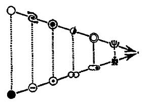 Например, если я рассмотрю предметы а, b, с, d – эту руку, мою собаку, цветы на столе и муху на оконном стекле, – я обнаружу, что их наибольший общий делитель – это клетка, а их наименьший общий множитель – Жизнь. Если я рассмотрю а’, b’, с’, d’ – мою руку, мою ручку, этот лист бумаги, чернила, которыми я пользуюсь – я обнаружу, что их НОД – молекула, а их НОМ – Земля. А если я рассмотрю а”, b”, с”, d” – мою руку и образцы материи схожей массы с поверхности Солнца, Марса и Венеры, то НОД – это атом, а НОМ – Солнце. В каждом случае присутствует анализ, или иерархический спуск, чтобы найти общие составляющие, за которым следует синтез, или иерархический подъем, чтобы найти общее целое; и чем ниже спуск, тем выше и подъем. Таким образом, Пары симметрично расположены вокруг горизонтальной оси иерархии.