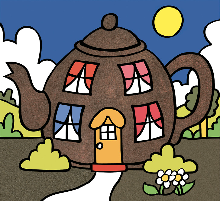 Su tetera tenía dos dormitorios, un baño, una cocina y un comedor y Mr. Divertido vivía muy contento en su casa.