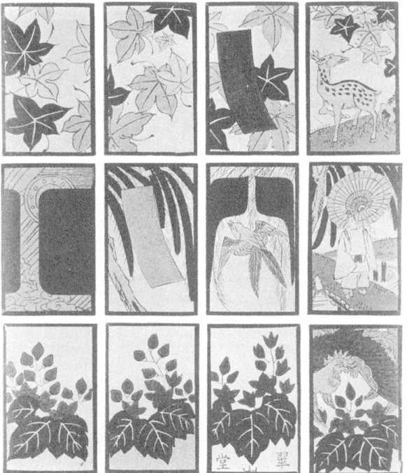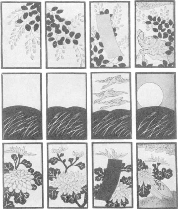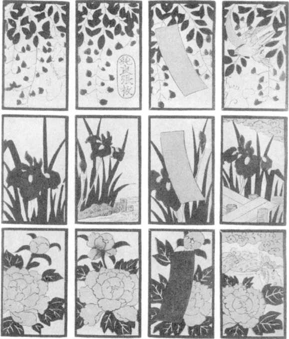 Игральные карты в Японии отличаются нежной окраской и тонкой печатью, а также очарованием в соответствии с названиями игр, для которых они предназначены. Существуют поэтические игры, основанные на древней романтической литературе; «цветочные игры» с 12 цветами, по которым называются месяцы года в Японии. Игра в цветы – самая распространенная в Японии и самая очаровательная из всех остальных. Колода состоит из 48 листов с изображением цветов на каждый месяц в четырех разных фазах. Размеры таких карт обычно составляют около 1'/4 дюйма на четверть дюйма. Каждый печатный лист крепится в толстой черной картонке.