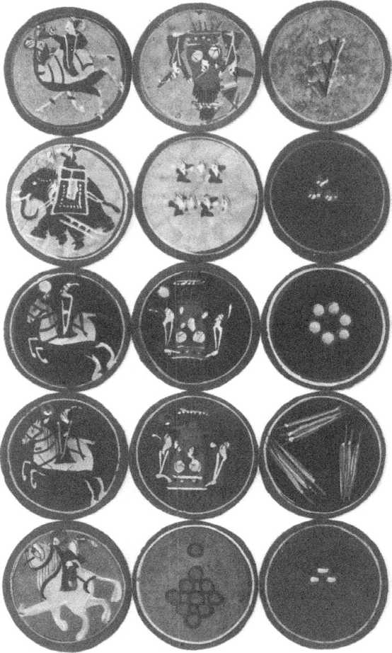 Здесь представлены карты от единицы до десятки и две фигурные – четырех младших мастей – «Чунг» (арфы), «Суркх» (солнца), «Бурат» (аттестаты) и «Куймаш» (товары)