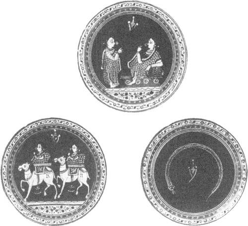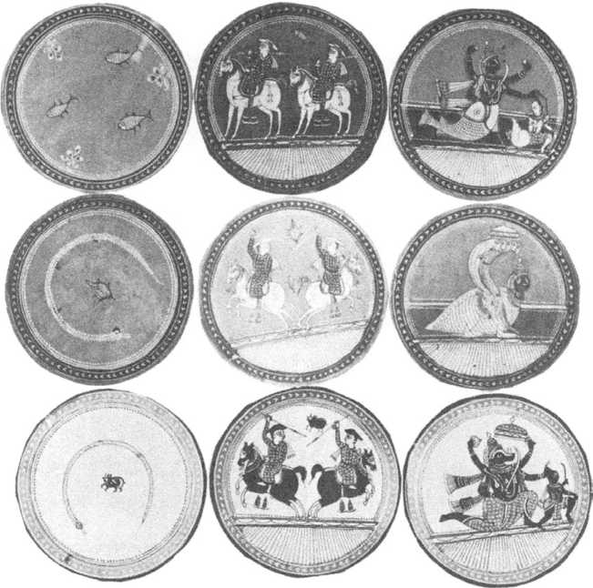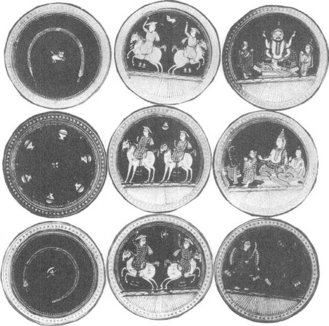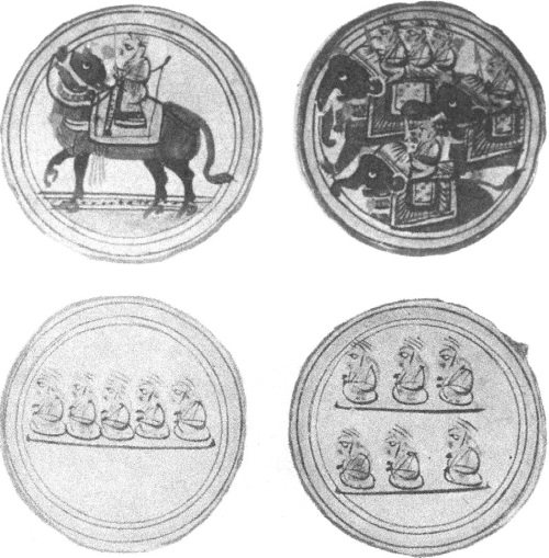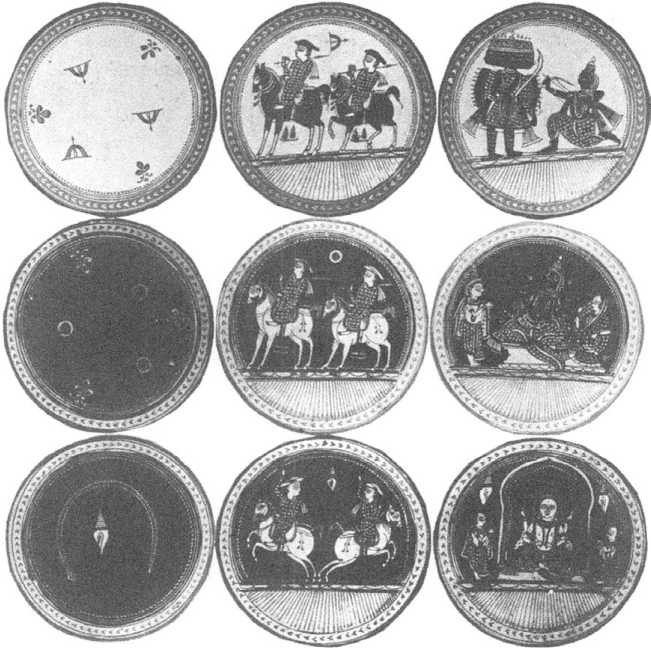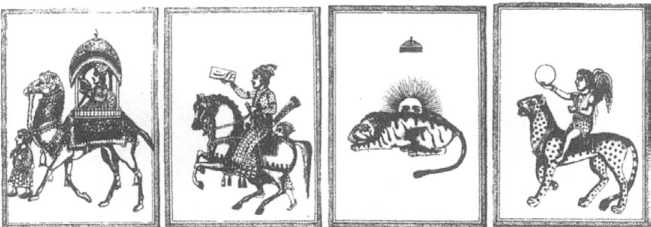 Неполные серии древних раскрашенных игральных карт, подробное описание которых у нас отсутствует, представляют большой интерес своим необычным оживлением почестей. Вишну изображается на белой лошади, на черном слоне в яркой попоне, на золотом льве и на пегом верблюде.