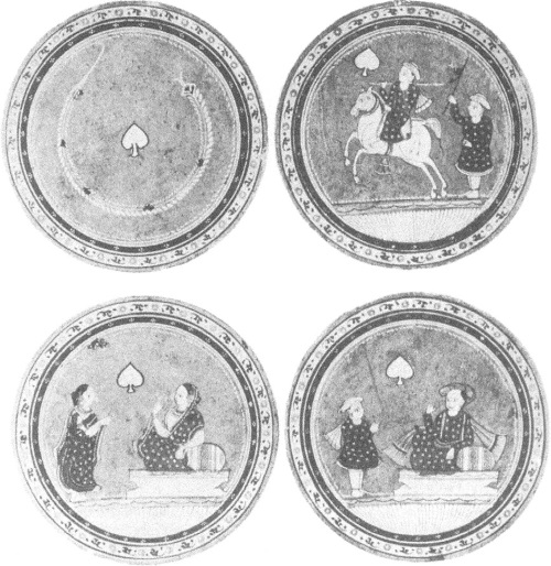 В нашем распоряжении находится колода таких лакированных игральных карт из Джайпура в лакированной коробке, которые вполне могли использовать в таком варианте. Они составляют всего лишь один дюйм в диаметре и, судя по мастерству исполнения, могут относиться к XVIII в.