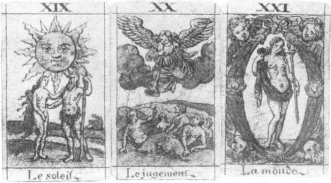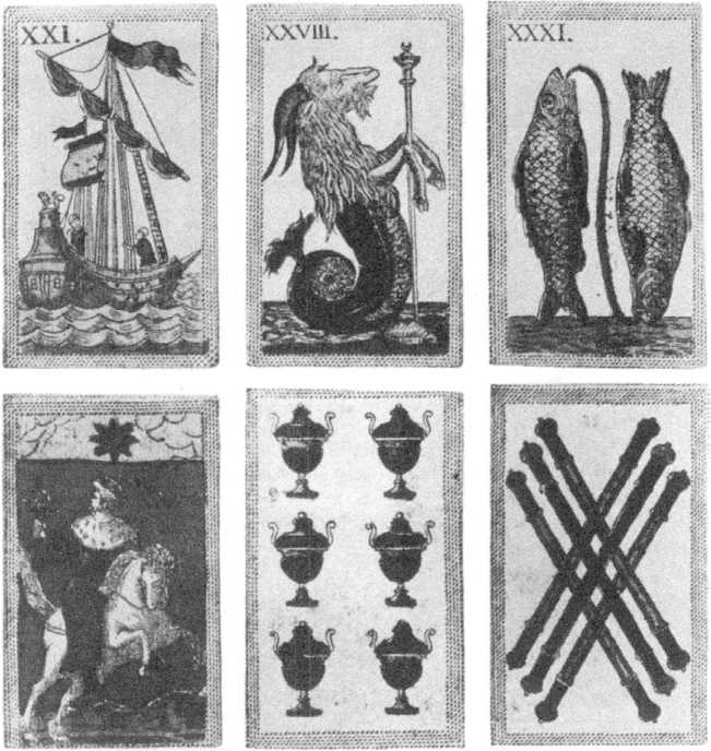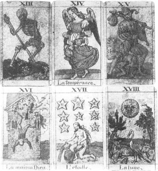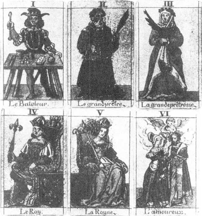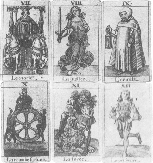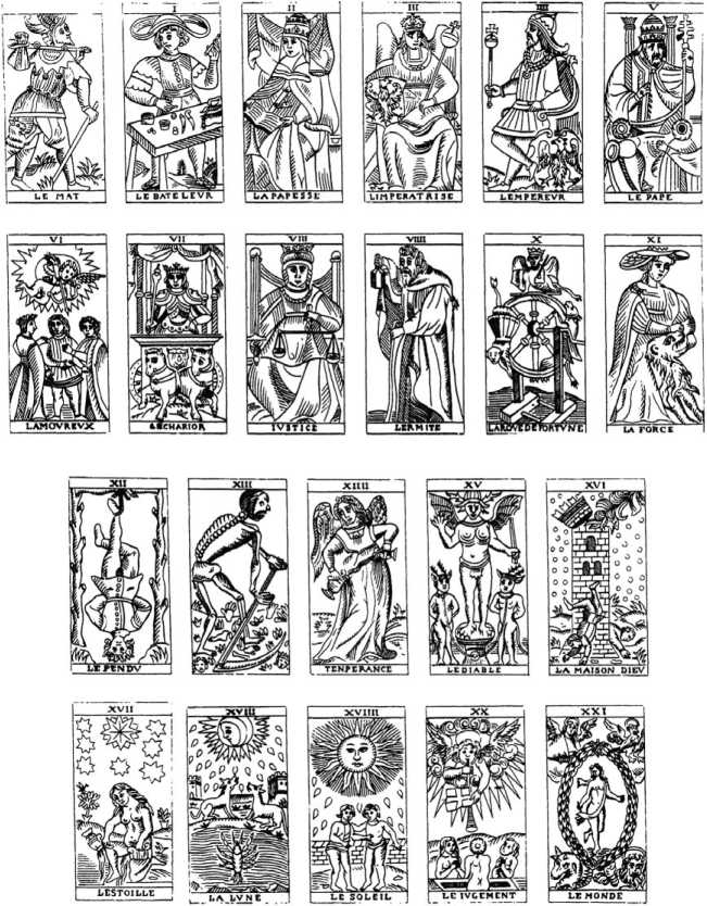 По поводу этих странных карт написаны многочисленные объяснения и толкования; наиболее известная и подробная разработка значения их происхождения содержится в труде, составленном Куром де Жебеленом в 1781 г. Этот труд представляет собой совершенное теоретическое творение, но его увлекательно прокомментировал Зингер в своих «Исследованиях по истории игральных карт». Забавно то, что названия этих арканов даже в итальянских и немецких колодах всегда приводятся на французском языке, причем нередко в искаженном до безобразия написании. В этом заключается очередная загадка, так как именно французы первыми отказались от таких карт, и сегодня их можно найти разве что в Италии, Германии, Швейцарии, Австрии, Богемии и Венгрии.