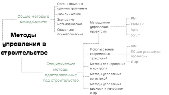 Важное место в структуре управления в строительстве приобретают конкретно сформулированные методологии управления проектами, которые представляют под собой систематизированный набор правил, процессов и инструментов, использующихся в целях эффективного планирования, выполнения, контроля и завершения строительного проекта. Сегодня существует обширное число методологий управления проектами и концепций, которые позволяют адаптировать управленческую практику под стилевые характеристики конкретного руководителя и специфику коллектива – их выбор остается задачей конкретной организации и при этом от этого выбора зависит характер реализации механизма управления.