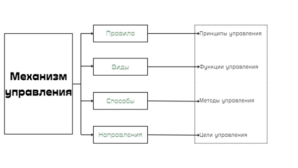 Механизм управления – это совокупность правил, целей, направлений, методов и конкретных способов и функций управления с выделением управленческой деятельности. Механизм управления и его реализация основан на ключевых принципах менеджмента и включает в себя структуру взаимосвязанных между собой элементов (рис. 4):
