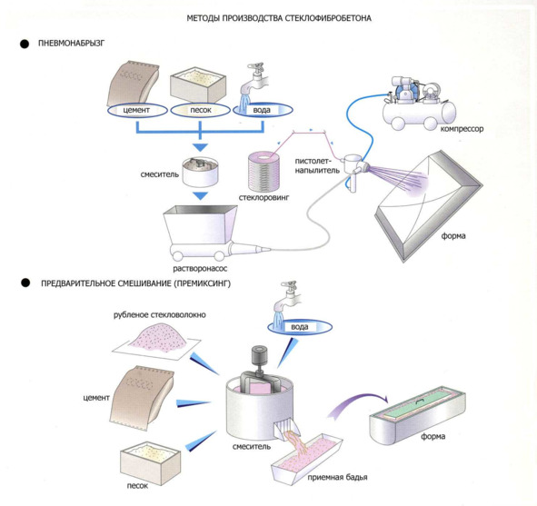 Рис. Технологические цепочки для получения стеклофибробетона двумя основными методами – набрызгом и премиксингом36