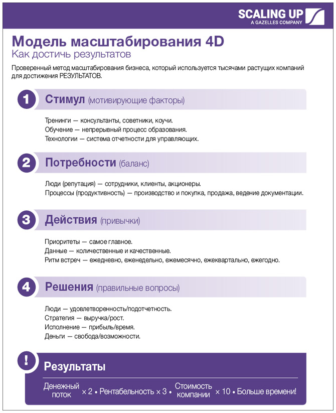 Чтобы начать работу с моделью 4D, задайте себе первый вопрос: «Какая из четырех сфер деятельности – люди, стратегия, исполнение или деньги – требует наибольшего внимания в настоящий момент?» С нее и начните. На сайте scalingup.com доступна методика оценки всех четырех сфер деятельности и выбора наиболее проблемной.