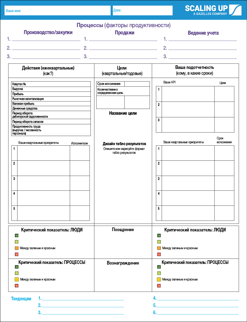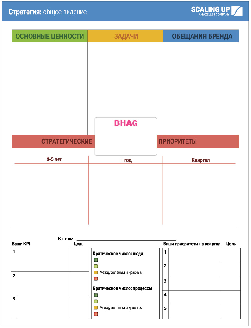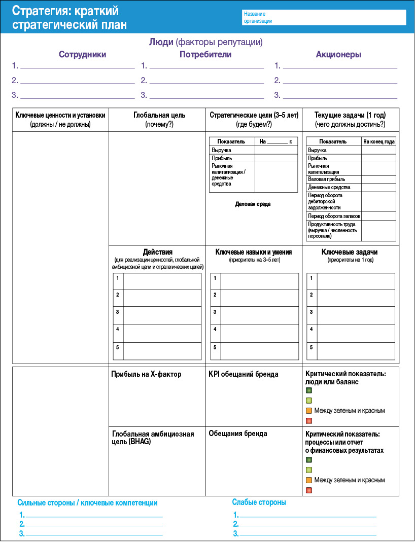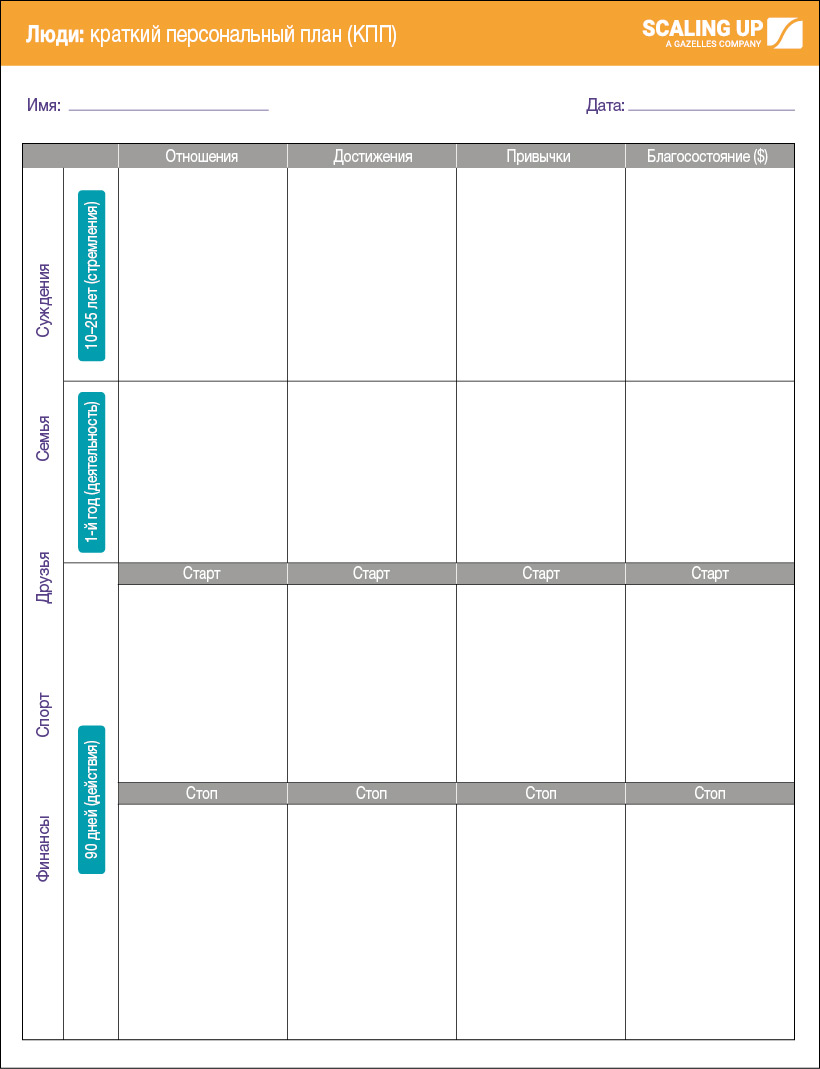 Краткий персональный план (КПП). Ваша личная и профессиональная жизнь тесно переплетены, и желательно поддерживать баланс между ними. Этот инструмент помогает распределить усилия по четырем областям – отношения, достижения, традиции и благосостояние, – которые соотносятся с четырьмя сферами вашей деятельности в бизнесе (люди, стратегия, исполнение и деньги). Стабильная, полноценная личная жизнь создает прочное основание для успеха в бизнесе.