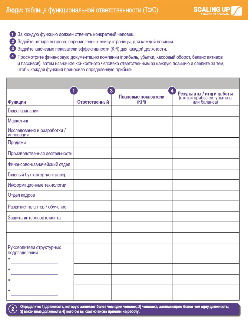 Таблица функциональной ответственности (ТФО). Джим Коллинз, автор книги «От хорошего к великому»[12], подчеркивает, как важно назначить правильных людей на правильные должности. В конце концов, самое узкое место – всегда на самом верху бутылки! Таблица функциональной ответственности содержит список должностей, которые должны быть в любой организации.