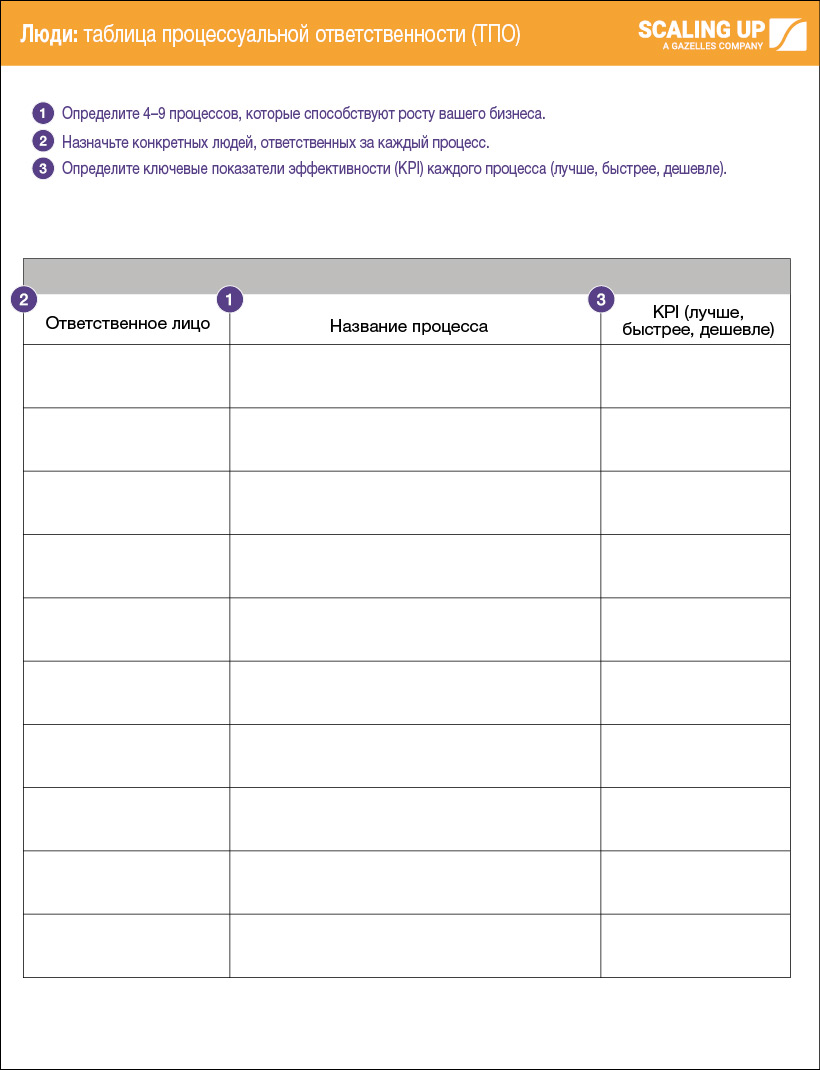 Таблица процессуальной ответственности (ТПО). Основная часть рабочих процессов осуществляется горизонтально и требует выполнения различных функций. Последние отнюдь не обособлены друг от друга. Если они плохо взаимодействуют, работа всей компании может остановиться. От этих процессов зависит то, как ваш бизнес воспринимают ваши клиенты и сотрудники. А это напрямую влияет на то, какое впечатление от вашего бизнеса складывается у акционеров!