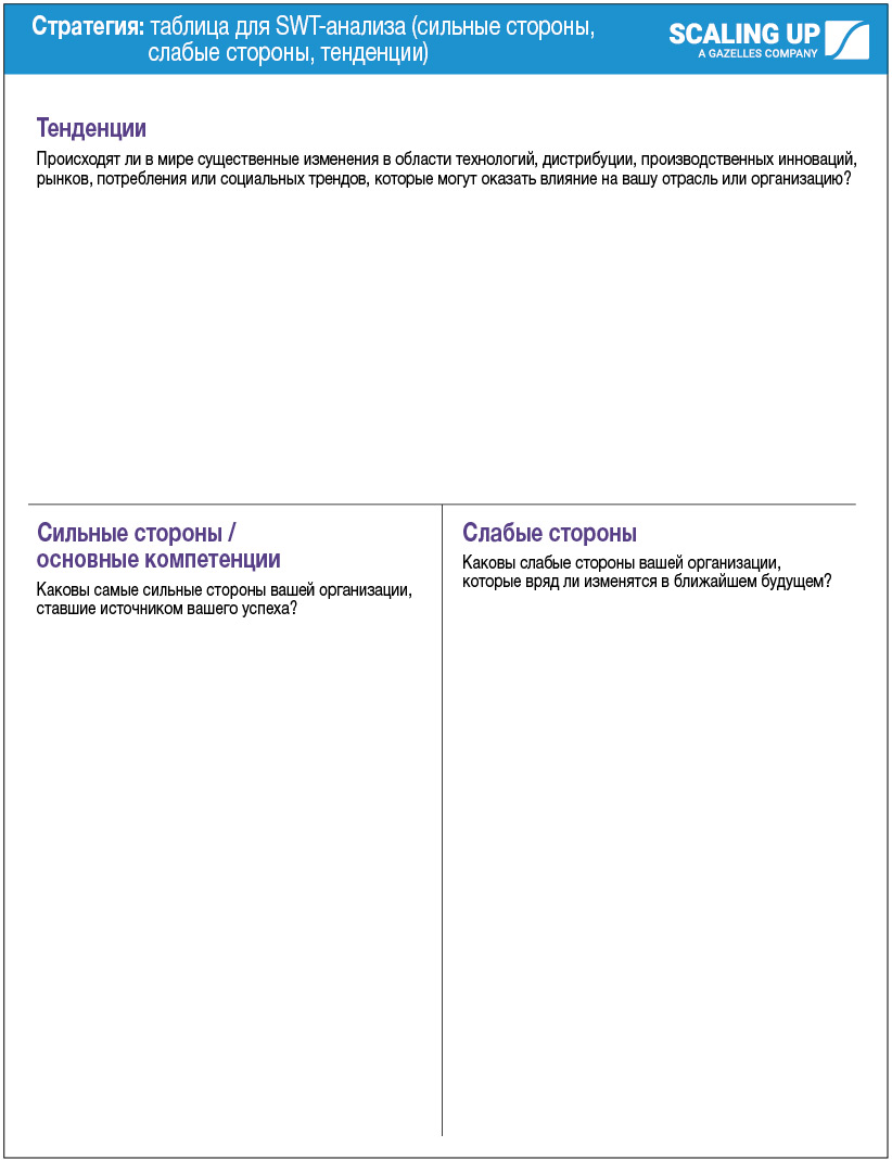 SWT-анализ. Мы преобразовали стандартный SWOT-анализ (анализ сильных и слабых сторон, возможностей и рисков), превратив его в SWT-анализ – анализ тенденций, сильных и слабых сторон.