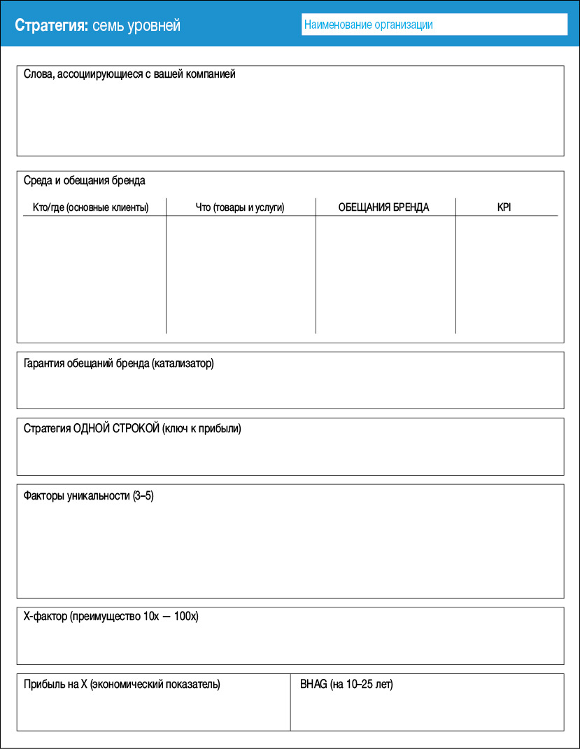Семь уровней стратегии. Этот инструмент помогает выделить семь компонентов (уровней) эффективной и доступно изложенной стратегии. С его помощью ваша компания сможет отстроиться от конкурентов и занять лидирующие позиции в своей рыночной нише.