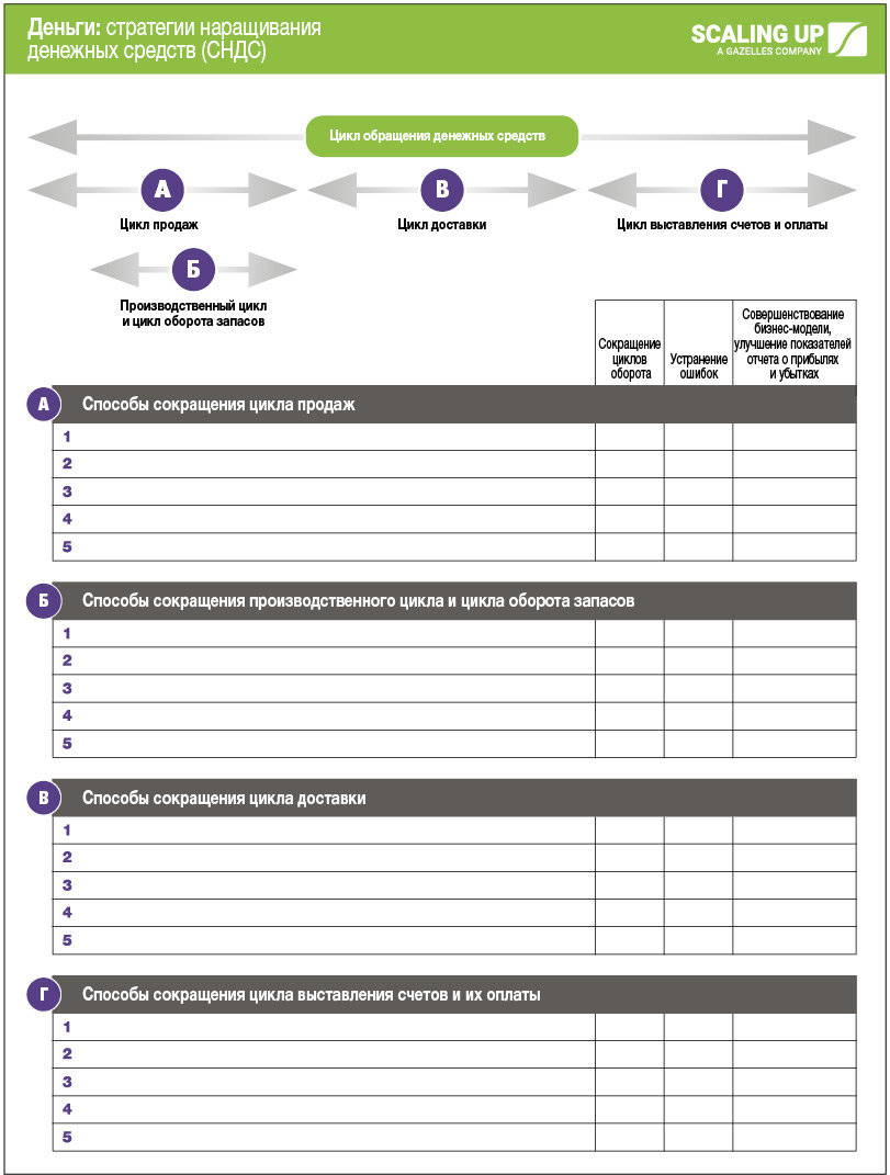 Цель этого инструмента – победить первый закон бизнес-гравитации и создать жизнеспособную модель бизнеса, которая генерирует тем больше денег, чем быстрее растет бизнес. Этого можно достичь за счет использования предоплаты, сокращения сроков оплаты задолженности, сокращения цикла продаж и доставки. Таким образом, вы сможете выстроить компанию, способную финансировать собственный рост.