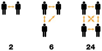 Вспомните те времена, когда ваша компания состояла всего лишь из основателя, секретаря и бизнес-плана, написанного на салфетке. У вас было всего два канала коммуникации, то есть два уровня сложности. Добавьте к ней третьего человека (или продукт, или точку продаж), и уровней сложности станет уже шесть. Включите в эти отношения четвертого участника, и количество связей вырастет до двадцати четырех.