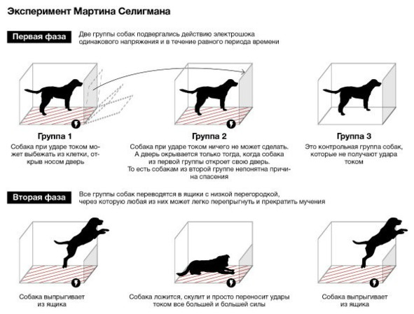 Выученная беспомощность на примере эксперимента с собаками. У людей все то же самое, только методы не такие явные. Заметьте, в конкретном случае с собаками нет никаких «скрытых выгод» так себя продолжать вести, а у людей они есть.