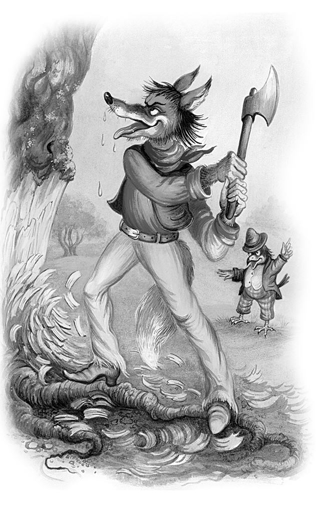 – Почему-то клочок его шерсти тут, на кусте ежевики, – говорит Братец Лис, – а пришёл он с другой стороны!