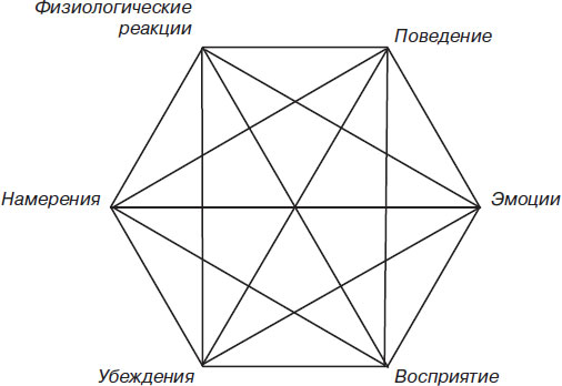 НОВАЯ ПАРАДИГМА ЗАИКАНИЯА задай они мне вопрос, я бы их ознакомил с той парадигмой заикания, которая возникла у меня из собственного жизненного опыта. Я пришел к пониманию заикания не просто как к речевой проблеме, а как к системе, вовлекающей всего человека, – интерактивной системе, состоящей не менее чем из шести компонентов: поведения, эмоций, восприятия, убеждений, намерений и физиологических реакций. Эта система может быть представлена в виде шестиугольника, каждая вершина которого воздействует и подвергается воздействию со стороны всех остальных вершин. И этим динамическим взаимодействием шести компонентов система заикания поддерживается в относительном балансе.