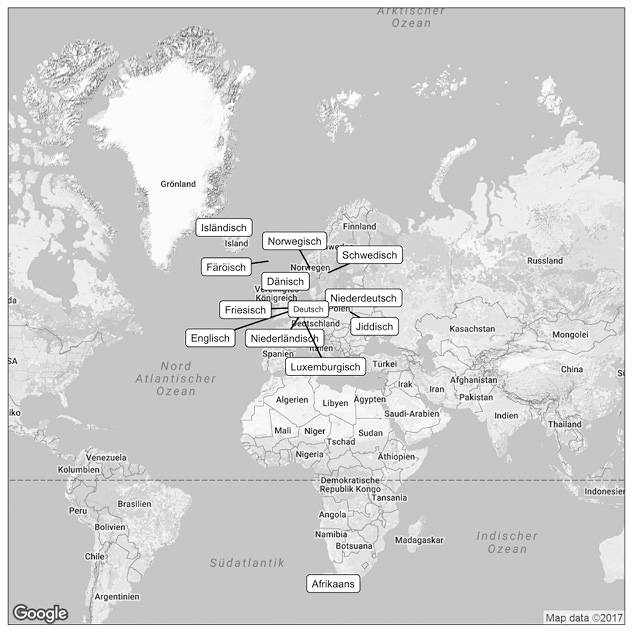 Das Deutsche gehört zu den germanischen Sprachen, die sich in nord- und westgermanische Sprachen untergliedern lassen (die ostgermanischen Sprachen, zu denen das Gotische gehörte, sind ausgestorben). Die nordgermanische Sprachfamilie bilden Isländisch, Färöisch, Norwegisch, Schwedisch und Dänisch. Das Deutsche ist eine westgermanische Sprache. Weitere westgermanische Sprachen sind Englisch, Friesisch, Niederländisch, Afrikaans, Luxemburgisch und Jiddisch. Fig. 4 gibt einen Überblick über die germanischen Sprachen und die Regionen, in denen sie gesprochen werden. Auf der Karte ist jede Sprache einer bestimmten Koordinate zugewiesen. Diese Koordinaten wurden aus dem World Atlas of Language Structures (WALS) übernommen und stehen quasi stellvertretend für das Verbreitungsgebiet der jeweiligen Sprache. Das kann relativ groß sein – Deutsch zum Beispiel wird in Deutschland, Österreich und der Schweiz gesprochen, und es gibt Sprachinseln etwa in den USA und Südamerika (vgl. z.B. Glottolog, Hammarström et al. 2017).