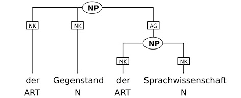 Was PWS was ist VAFIN sein der ART die Gegenstand NN Gegenstand der ART die Sprachwissenschaft NN Sprachwissenschaft ? $. ?In der linken Spalte ist der ursprüngliche Text zu sehen, der anhand der Leerzeichen in einzelne Tokens, also einzelne Wörter, untergliedert wird. Satzzeichen werden dabei ebenfalls als eigene Tokens behandelt. In der mittleren Spalte sehen wir die Part-of-Speech-Tags, rechts die Lemmata, also die unflektierten Grundformen. Neben dem Part-of-Speech-Tagging und der Lemmatisierung sind natürlich noch viele weitere Annotationen möglich. Viele Korpora sind beispielsweise auch syntaktisch geparst und lassen sich somit zum Beispiel nach Nominalphrasen, Verbalphrasen und anderen Einheiten auf syntaktischer Ebene durchsuchen. Fig. 6 zeigt dies am Beispiel der Nominalphrase der Gegenstand der Sprachwissenschaft, wobei die Knotennamen NK und AG für noun kernel (also: Kernelement einer Nominalphrase) und Attribute, Genitive (also: Genitivattribut) stehen.