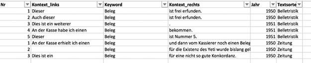 Eine Spalte = eine Kategorie. Jede Spalte enthält eine spezifische Sorte Daten. So gibt es eine Spalte für den linken Kontext, für das Keyword, für den rechten Kontext, ebenso je eine Spalte für Metainformationen wie Textsorte und Jahr.