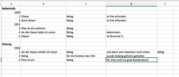 Leider sind die meisten Konkordanzen, die man mit Hilfe der Online-Schnittstellen von Korpora wie dem Deutschen Referenzkorpus exportieren kann, für die Bearbeitung in Tabellenkalkulationsprogrammen nicht unmittelbar geeignet. Im digitalen Begleitmaterial finden sich daher einige Tutorials sowie interaktive Skripte, mit denen sich die Exportdateien in „gute“ Konkordanzen überführen lassen.