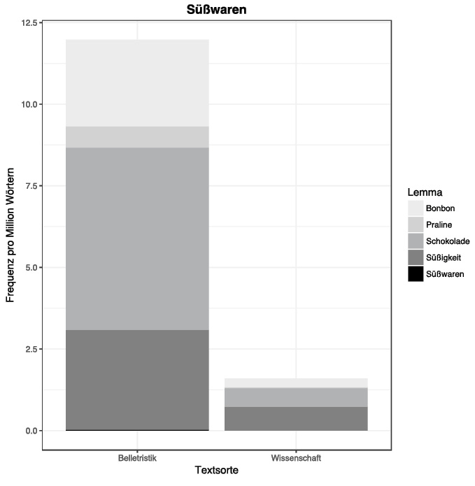 Fig. 5: Relative Frequenz von fünf Lexemen aus dem Wortfeld „Süßwaren“ in belletristischen und wissenschaftlichen Texten des DWDS-Kernkorpus des 20. Jahrhunderts.