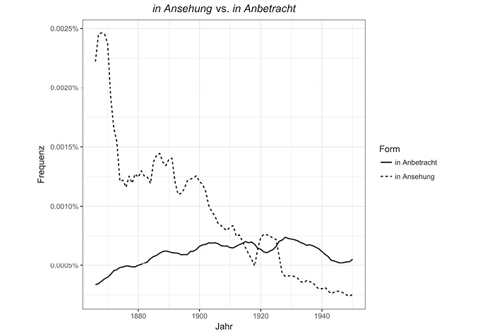 Fig. 10: Frequenz von in Ansehung vs. in Anbetracht im Google Ngram Viewer. (Anteil der jeweiligen Form an allen Tokens im GoogleBooks-Korpus.)