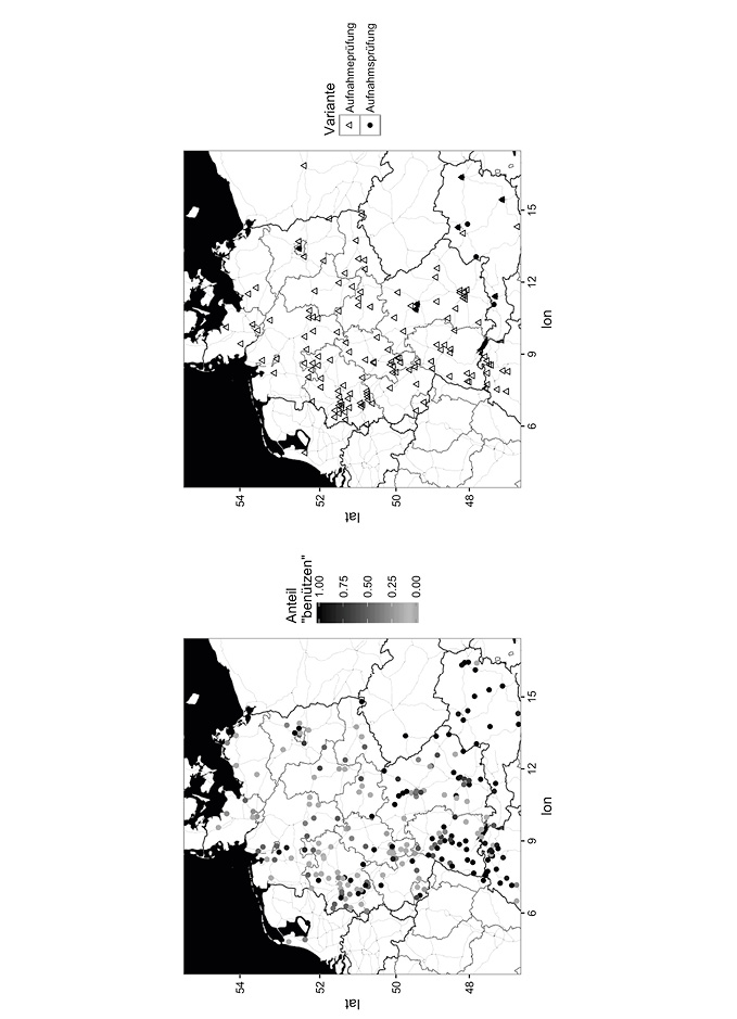 Das Ziel von Webkorpora ist es, das Potential, das allein schon die schiere Menge an Internettexten birgt, zu nutzen und die entsprechenden Daten linguistisch zu erschließen, ohne die Einschränkungen, die kommerzielle Suchplattformen mit sich bringen, in Kauf nehmen zu müssen. Fürs Deutsche gibt es derzeit zwei Korpora, die große Mengen an Textdaten aus dem Web in linguistisch aufbereiteter Form zugänglich machen. Das derzeit größte Webkorpus ist DECOW (Schäfer & Bildhauer 2012), derzeit (Stand Ende 2016) verfügbar in der Version DECOW16AX. Aus urheberrechtlichen Gründen enthält es jedoch keine Texte, sondern lediglich Satzsammlungen. Diese sind jedoch linguistisch annotiert, d.h. lemmatisiert und mit Auszeichnungen für die jeweilige Wortart (sog. POS-Tags, für part of speech) versehen. Darüber hinaus gibt es zu jedem Satz den Link zu der Website, auf der er gefunden wurde1, und geographische Daten, die aus den jeweiligen IPs gewonnen wurden. Letztere sind natürlich insofern relativ unzuverlässig, als sie keine Auskunft darüber geben, ob die Person, die den jeweiligen Satz verfasst hat, tatsächlich dort wohnt; und selbst wenn dies der Fall sein sollte, bedeutet es nicht zwangsläufig, dass sie auch dort sozialisiert wurde.2 Im populärwissenschaftlichen, aber sehr empfehlenswerten „Sprachlog“ hat jedoch Susanne Flach gezeigt, dass sich die Geo-IP-Daten durchaus – in begrenztem Maße und mit der gebotenen Vorsicht – für dialektologische Fragestellungen nutzen lassen.3 Ein exemplarischer Vergleich zwischen COW-Daten und Daten aus dem „Atlas der Alltagssprache“, der die regionale Verteilung solcher Alternanzen auf Grundlage von Internetumfragen kartiert, legt nahe, dass sich die geographische Distribution der Korpusdaten zumindest in den beispielhaft untersuchten Fällen ungefähr mit jener, die im Rahmen des AdA-Projekts erhoben wurde, deckt. So zeigen die AdA-Daten, dass im Falle der Alternanz benutzen vs. benützen die umgelautete Form ein Phänomen ist, das sich weit überwiegend im oberdeutschen Sprachraum, also im Süden des deutschen Sprachgebiets, findet. Diese areale Verteilung wird auch in Fig. 9 (links) deutlich, die auf einer Stichprobe aus DECOW14AX beruht. Mit Hilfe des (mittlerweile überholten) Online-Tools Colibri2 (Schäfer 2015) wurden Stichproben von jeweils 10.000 Tokens für benützen und benutzen genommen. Ungefähr ein Drittel der Daten konnte anhand der Geo-IP einem Ort zugeordnet werden (3.514 für benützen, 3.591 für benutzen). Allerdings bildet die Grafik lediglich für jeden in den Daten identifizierbaren Ort den Anteil der umgelauteten Variante ab (dargestellt anhand der Farbintensität: je dunkler, desto mehr benützen), ohne dass die enormen Frequenzunterschiede zwischen den einzelnen Orten berücksichtigt werden. Die weitaus meisten Belege stammen – wenig überraschend – aus Ballungsgebieten wie Berlin (Platz 1 bei benutzen), der Region um Düsseldorf (Höst bei Düsseldorf belegt Rang 2), Nürnberg (Platz 3) oder Hamburg (Platz 4). Damit ist auch zu erklären, dass sich in der Region um Berlin sehr viel häufiger benützen findet als anderswo in der nördlichen Hälfte Deutschlands – die Grundgesamtheit ist schlichtweg höher. Auch für die im Österreichischen verbreitete Variante Aufnahmsprüfung, deren Verteilung die rechte Hälfte von Fig. 9 auf Grundlage von DECOW14AX-Daten zeigt, finden sich in Berlin immerhin 2 Belege. Von den 5.060 Belegen für Aufnahmeprüfung und 77 Belegen für Aufnahmsprüfung, die mit Hilfe von Colibri2 gefunden wurden, können 2.094 bzw. 30 einem Ort zugeordnet werden, wobei sich deutlich die areale Konzentration der Variante mit Fugen-s im österreichischen Raum zeigt. Diese Stichproben lassen den Schluss zu, dass die Daten des COW-Korpus für die Ermittlung der arealen Verteilung sprachlicher Varianten zumindest nicht ganz unbrauchbar sind.