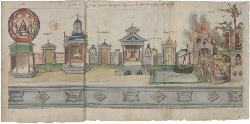 [36] Декорации к Валансьенской мистерии. Миниатюра из Манускрипта Юбера Кайо. 1547