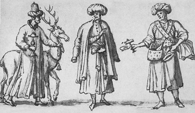 [40] Три волхва, несущие благовония, золото и мирру (из фламандской рождественской мистерии) . Рисунок. XVI век