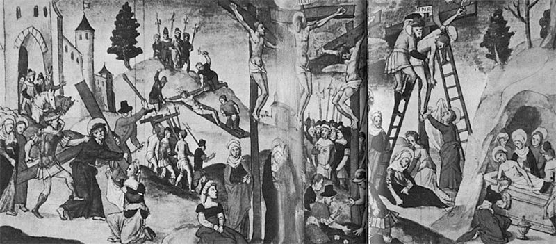 [42] Сцены из Валансьенской мистерии (от Несения креста до Положения во гроб). Миниатюра из Манускрипта Юбера Кайо (см. также ил. 36). 1547